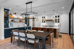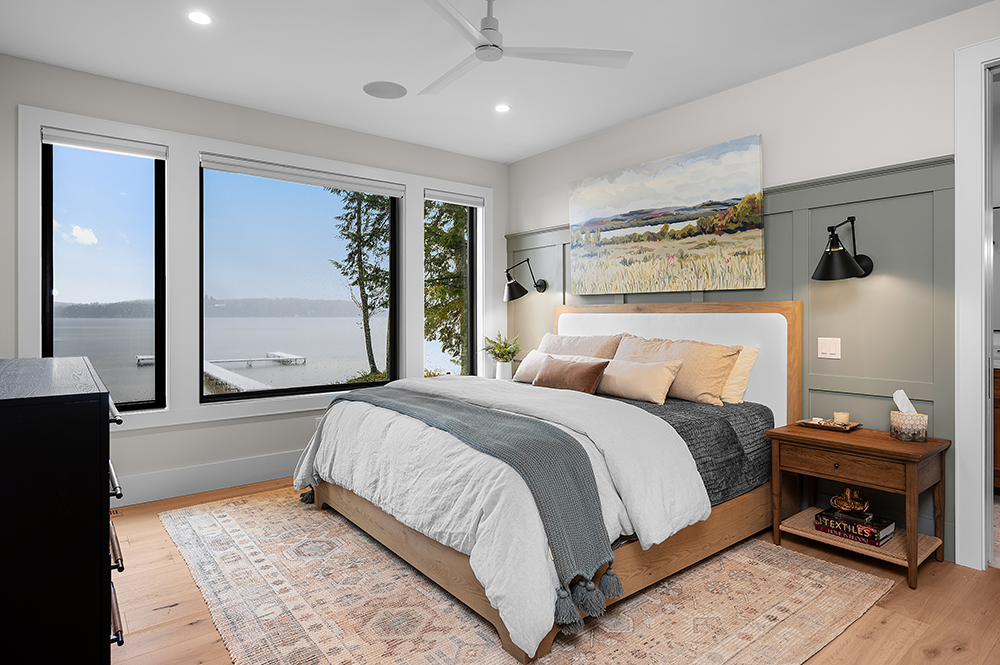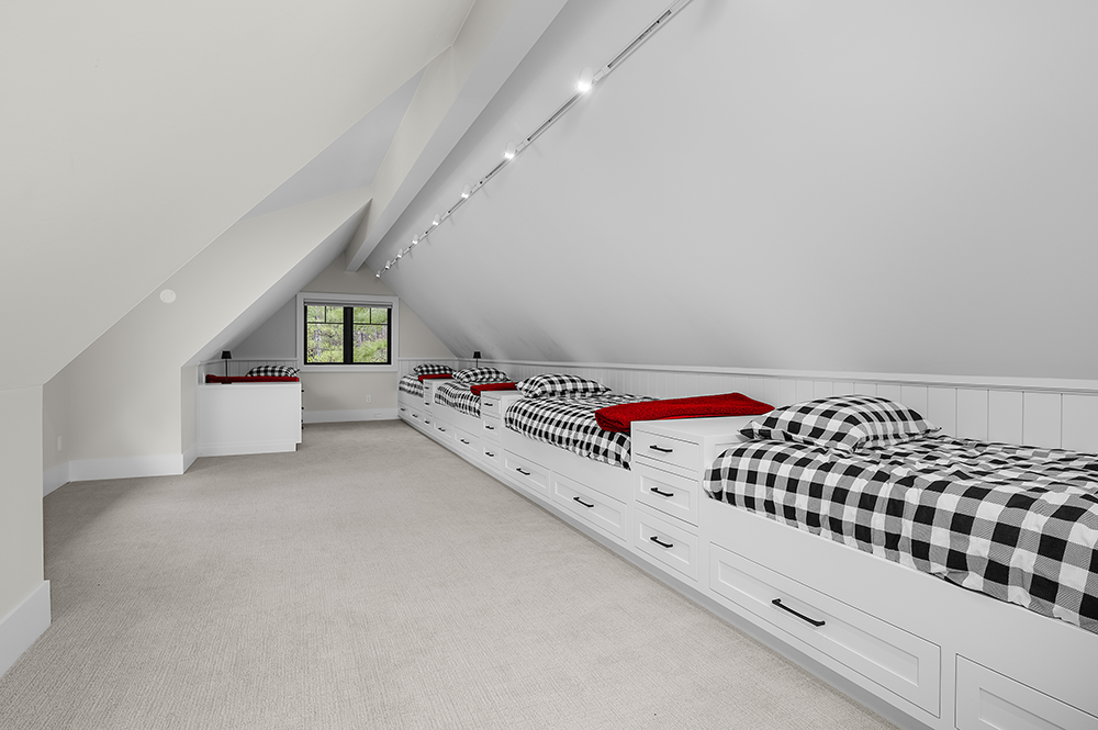 If your happy place is sitting in an adirondack chair with a glass of iced tea looking out over the lake, come visit our custom lakeside cottage. This year’s home features a custom kitchen, sunroom, timber accented great room, and a master suite that all face the sunrise side of the lake. Unique 16' wide accordion doors between the kitchen and sunroom open up to expand the living area out towards the lake. At 3413 sq' the home is not at all over sized, but its smart design allows for 4 bedroom suites as well as a bunk room that has built-in sleeping space for five, all without anything feeling cramped.